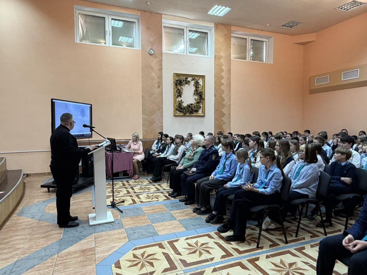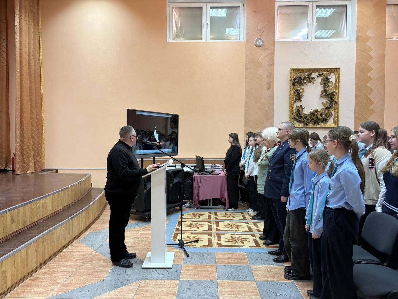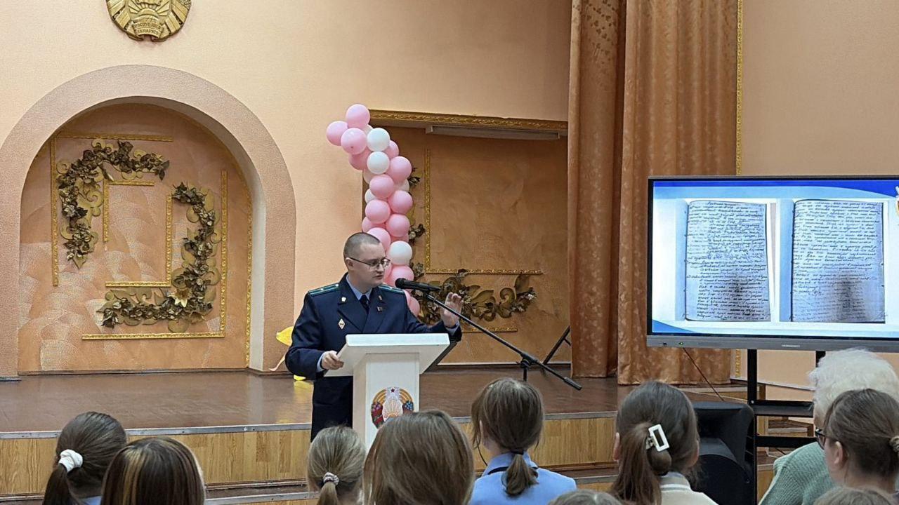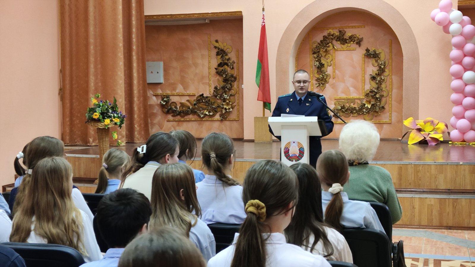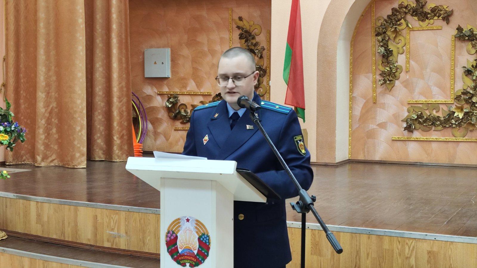 Также перед школьниками выступил старший прокурор отдела прокуратуры Витебской области по надзору за исполнением законодательства о несовершеннолетних и молодежи С.А. Кирьянов. Он подробно рассказал о расследовании уголовного дела о геноциде и привел исторические факты.