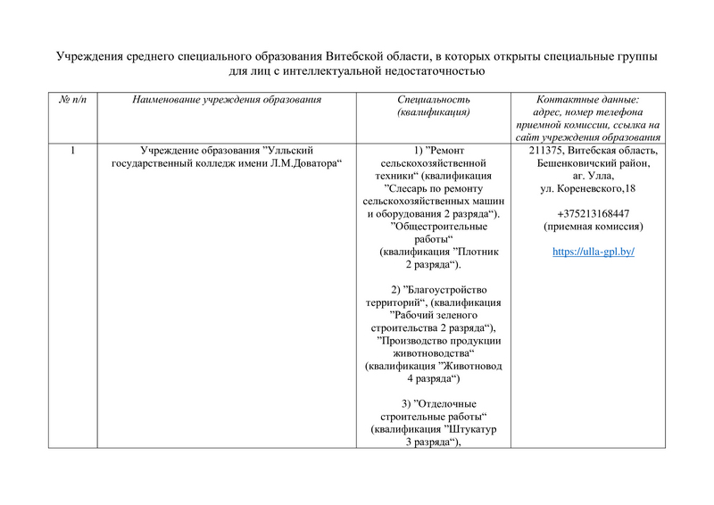 Главная | Учреждения среднего специального образования Витебской области, в которых открыты специальные группы для лиц с интеллектуальной недостаточностью